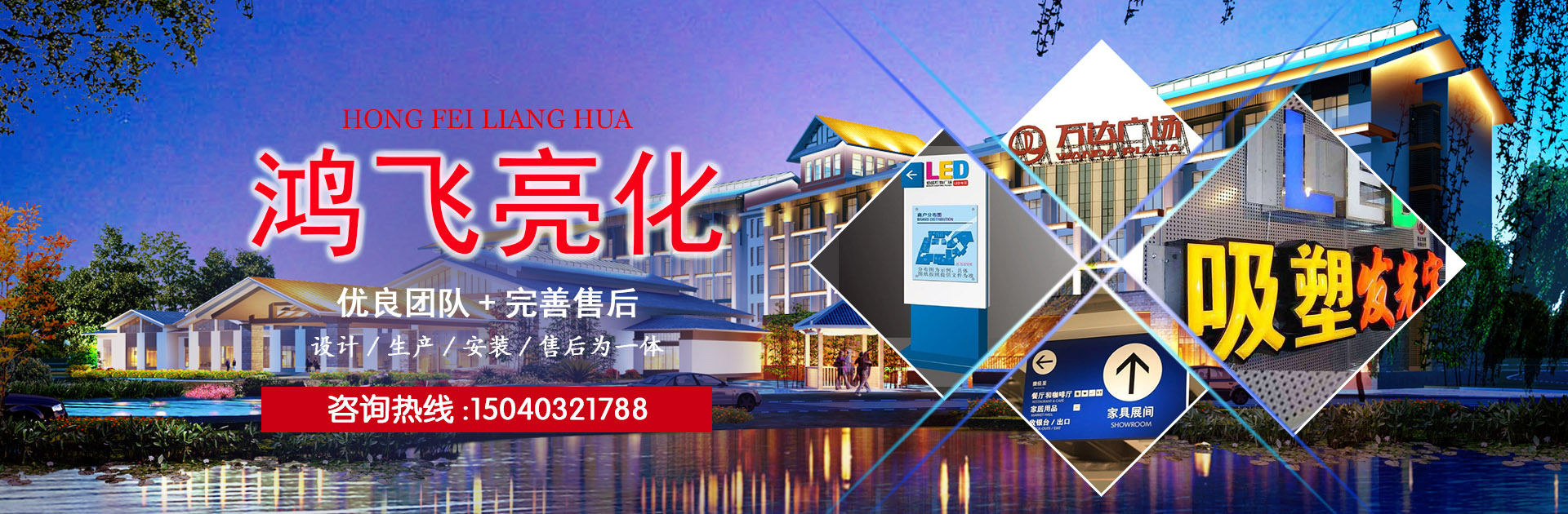ABOUT沈陽鴻飛亮化有限公司,成立于2009年,注冊資金200萬,本公司專業(yè)從事樓體亮化、LED發(fā)光字、樓頂大字、鋼結(jié)構(gòu)工程,是一家集設計、生產(chǎn)、安裝、售后為一體的綜合型公司。公司在不斷的拓展和創(chuàng)新過程中取得了沈陽市城鄉(xiāng)建設委員會頒發(fā)的城市及道路照明工程叁級資質(zhì),AAA級信用等級證書等一系列榮譽。自公司成立以來,活躍于各個行業(yè),為多家大型企業(yè)提供廣告解決方案,并多次承攬沈陽市及周邊城市亮化工程,贏得了客戶及業(yè)內(nèi)人士的一致好評,取得了良好的社會效應。 公司擁有獨立廠房,配備了一系列的先進生產(chǎn)設備,并且擁有一支技藝精湛素質(zhì)優(yōu)良的團隊,真誠的為廣大客戶服務。以誠信謀生存,以質(zhì)量求發(fā)展。沈陽鴻飛亮化有限公司全體員工將以無限的熱情,精湛的技術(shù)為廣大客戶服務。..